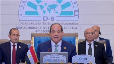 وترأس السيسي، القمة الحادية عشرة لمنظمة "الدول الثماني الإسلامية النامية" للتعاون الاقتصادي (D8) في العاصمة الإدارية الجديدة، اليوم الخميس، رؤساء دول العالم، بالتزامن مع التطورات الإقليمية والدولية المتسارعة التي يشهدها العالم، في وقت بالغ الأهمية.