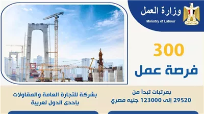 وفي سياق متصل، نشرت وزارة العمل، 300 فرصة عمل جديدة بإحدى شركات التجارة العامة والمقاولات في دولة عربية، في تخصصات متنوعة، مع رواتب تصل إلى 123 ألف جنيه.