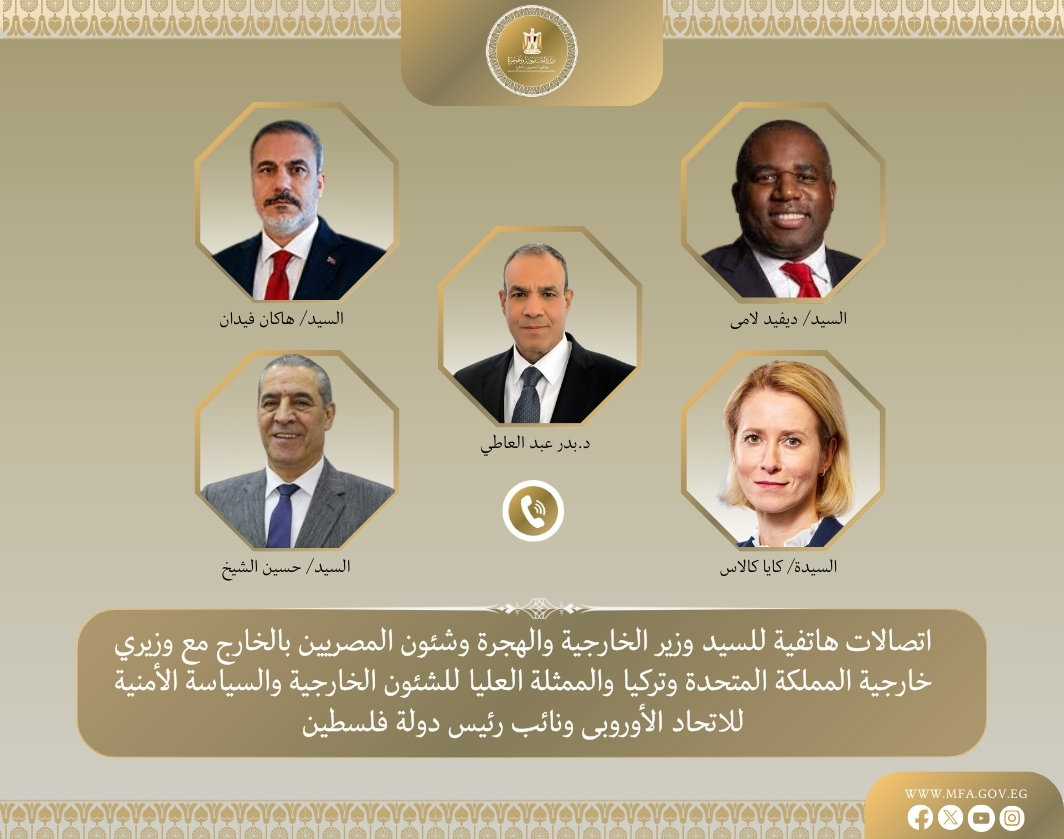 في إطار الاتصالات المكثفة مع الأطراف الدولية لدعم جهود وقف إطلاق النار في قطاع غزة، جرت اتصالات هاتفية بين الدكتور بدر عبد العاطي وزير الخارجية والهجرة وشئون المصريين في الخارج مع كل من ديفيد لامى وزير خارجية المملكة المتحدة، وهاكان فيدان وزير خارجية تركيا، وكايا كالاس الممثلة العليا للشئون الخارجية والسياسة الأمنية للاتحاد الأوروبى، وحسين الشيخ نائب رئيس اللجنة التنفيذية لمنظمة التحرير الفلسطينية ونائب رئيس دولة فلسطين، لبحث مستجدات الأوضاع الإقليمية وفى مقدمتها الوضع في غزة.