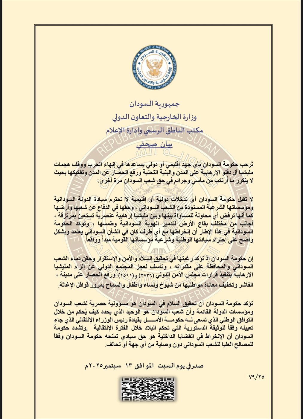 ورحبت الحكومة السودانية بالجهود الدولية والإقليمية التي يمكن أن تساعد على إنهاء الحرب ورفع الحصار عن المدن، والتي يمكن أن تساهم في تفكيك مليشيات الدعم السريع، وفق بيان وزارة الخارجية السودانية.