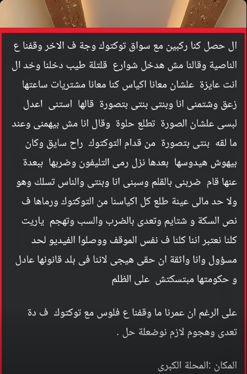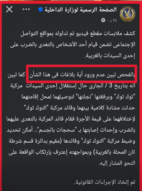 وتبين من الفحص لأنه لا يوجد أي بلاغات بشأن تعدي السائق على السيدة وابنتها، وانهما اكتفيان بمشاركة مقطع الفيديو، لربما أحد يتمكن من أخذ حقهما، كما تم التعرف على أن السائق من سكان المحلة ومقيم تمامًا في مدينة المحلة.