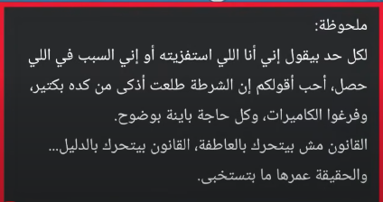 كما تداول أصحاب الفيديو (السيدة وابنتها) منشورًا على موقع التواصل الاجتماعي، قالا فيه "لكل حد بيقول إني أنا اللي استفزيته أو إني السبب في إللي حصل، أحب أقولكم إن الشرطة طلعت أذكى من كده بكتير، وفرغوا الكاميرات، وكل حاجة باينة بوضوح، والقانون مش بيتحرك بالعاطفة، القانون بيتحرك بالدليل والحقيقة عمرها ما بتستخبى).