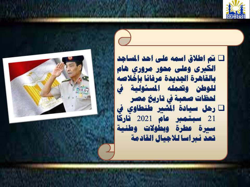 نشرت محافظة القاهرة عبر صفحتها الرسمية على موقع فيسبوك إنفوجرافًا توثيقيًا يستعرض حياة وإنجازات المشير محمد حسين طنطاوي، أحد أعظم قادة القوات المسلحة المصرية، الذي حمل على عاتقه مسؤولية الوطن في لحظات فارقة من تاريخه.