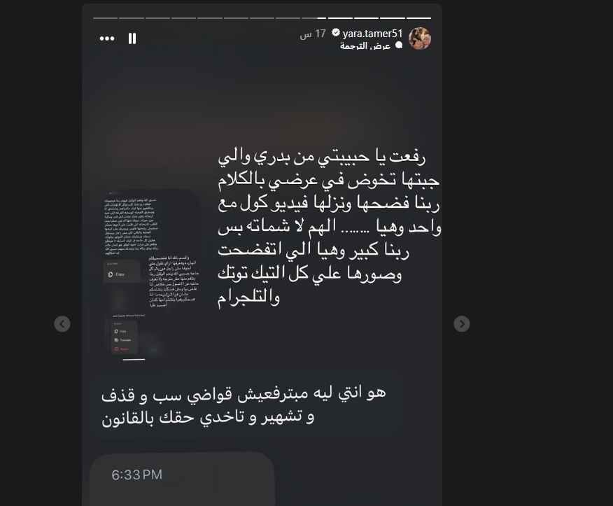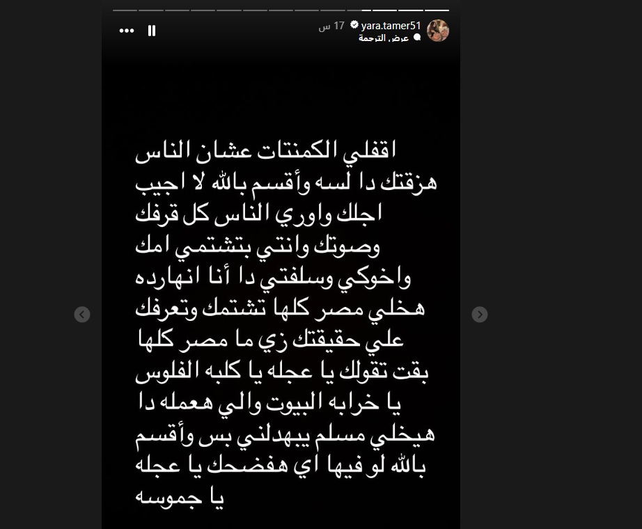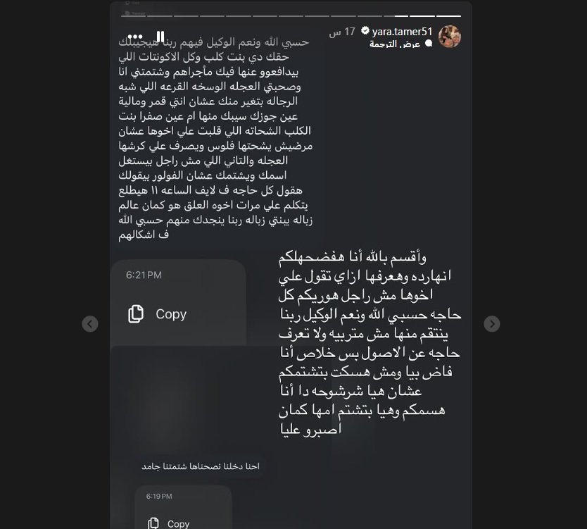وأكدت يارا في منشوراتها أنها تعرضت لإساءات متكررة من شقيقة زوجها، موضحة أن الأخيرة تفتعل مشكلات معها كلما رأت استقرارًا في حياتهما الزوجية، على حد قولها.