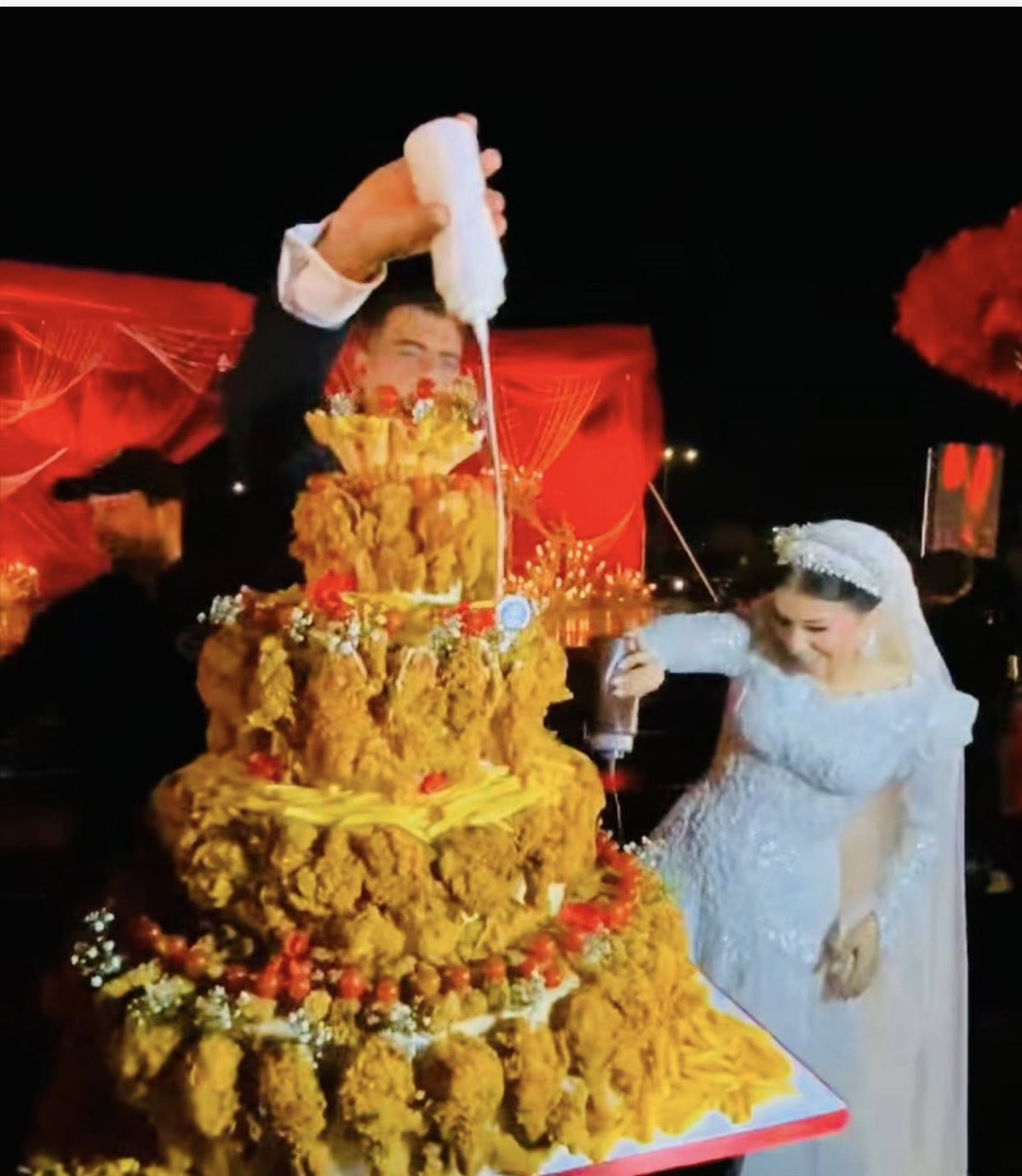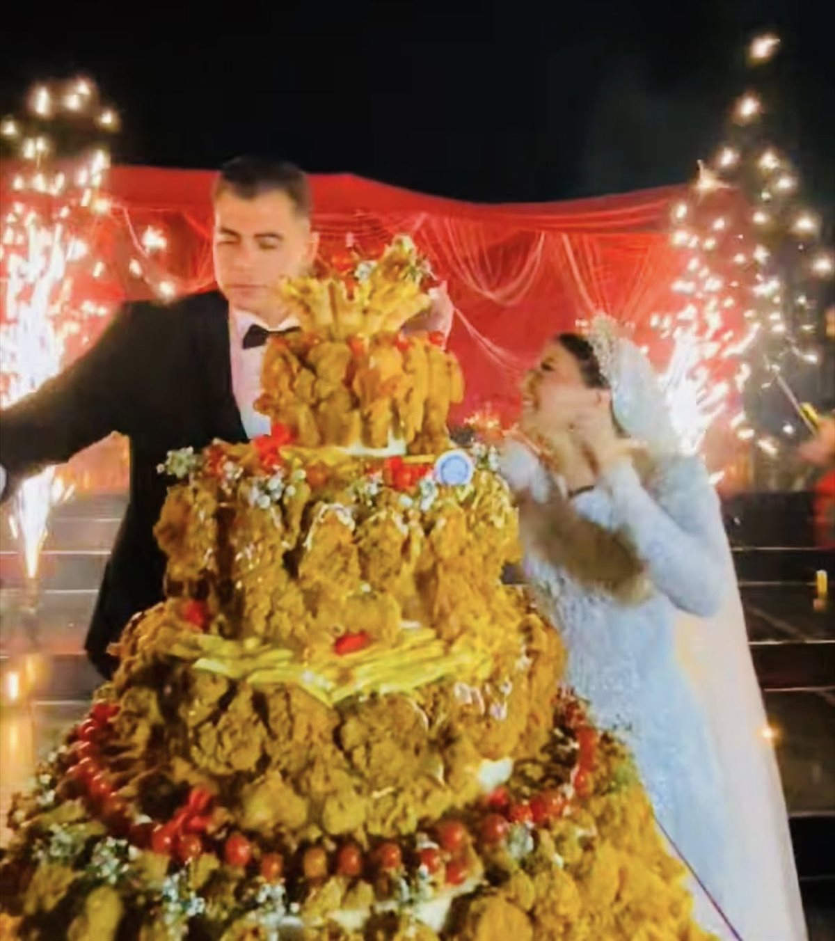 واحتفلت الميك آب ارتيست دينا هشام، ابنة الإعلامية هبة قطب، بزفافها واستبدلت فقرة التورتة المكونة من الكيك والشيكولاتة والفاكهة، بتورتة الفرايد تشيكن، ذات الأدوار المتعددة.