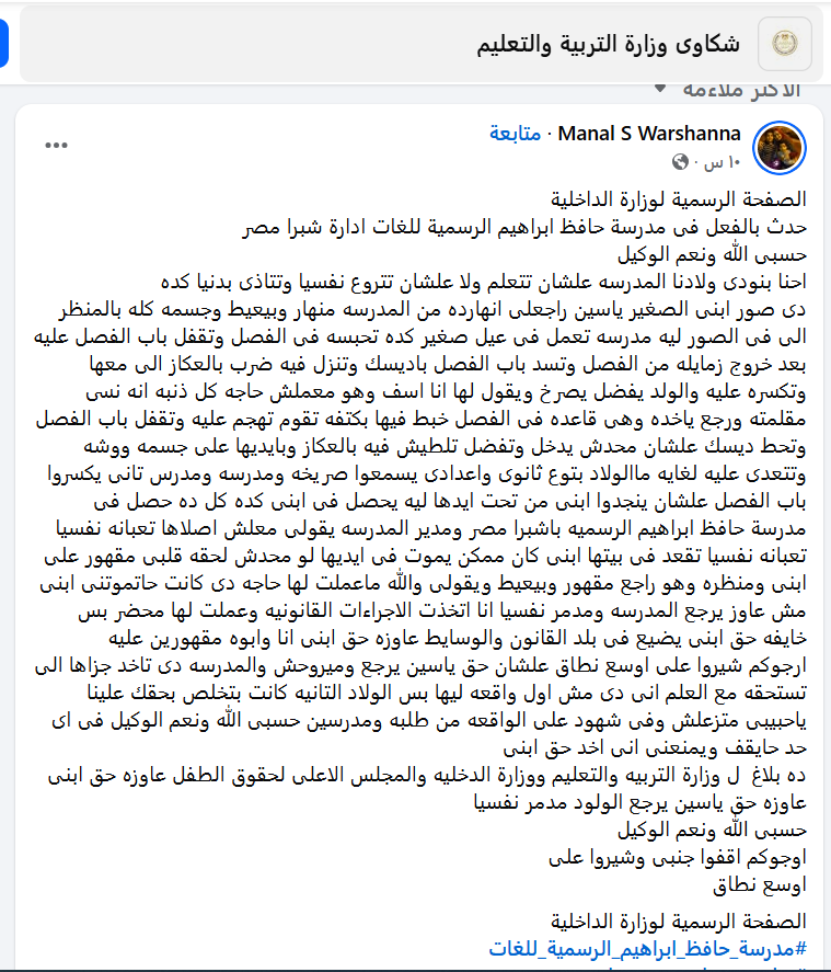 أم تستغيث من معلمة بشبرا، قدمت ولية أمر بمدرسة حافظ إبراهيم الرسمية للغات، إدارة شبرا مصر، شكوى واستغاثة لوزارة التربية والتعليم والتعليم الفني، ووزارة الداخلية وهذا بعد تعرض نجلها للضرب من إحدى المعلمات داخل الفصل، وهذا خلال منشور لها على موقع التواصل الاجتماعي فيسبوك.
