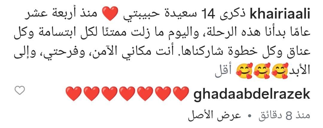 وعلقت نصًا، "ذكرى سنوية سعيدة يا حبيبي قبل أربعة عشر عامًا، بدأنا هذه الرحلة، وما زلت اليوم ممتنًا لكل ابتسامة، وكل عناق، وكل خطوة شاركناها، أنتِ ملاذي الآمن، وفرحتي، وسعادتي الأبدية".