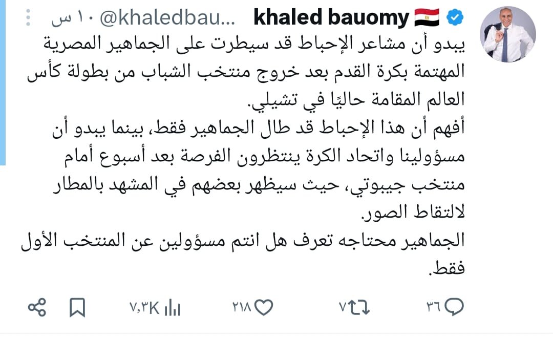 وكتب خالد بيومي عبر حسابه الرسمي على منصة إكس: "يبدو أن مشاعر الإحباط قد سيطرت على الجماهير المصرية المهتمة بكرة القدم بعد خروج منتخب الشباب من بطولة كأس العالم المقامة حاليًا في تشيلي".