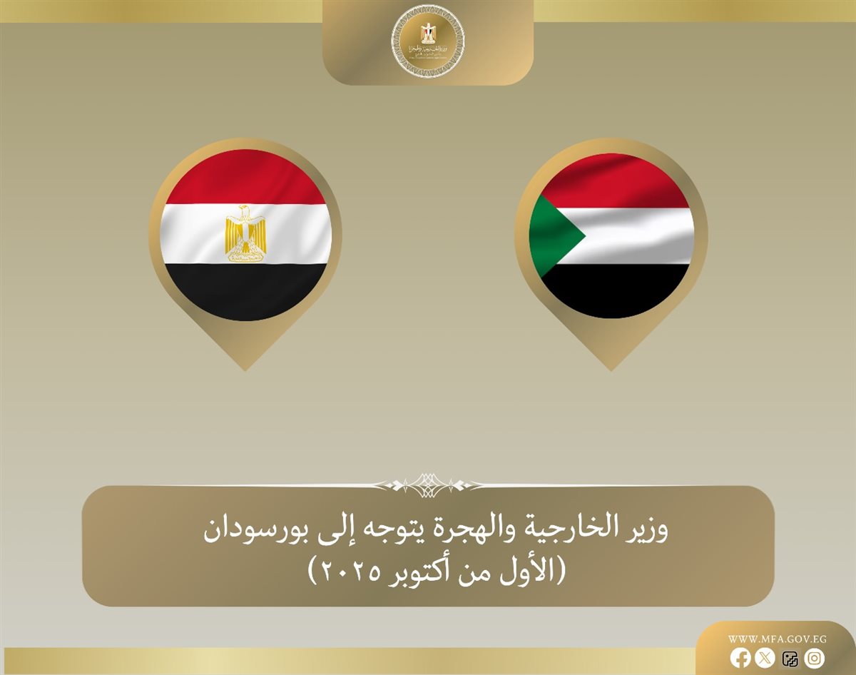 توجه د. بدر عبد العاطي وزير الخارجية والهجرة وشئون المصريين بالخارج يوم الأربعاء الاول من أكتوبر ٢٠٢٥ إلى مدينة بورسودان في زيارة ثنائية، حيث من المقرر أن يلتقي وزير الخارجية مع عدد من كبار المسئولين السودانيين لبحث سبل تعزيز العلاقات الثنائية بين البلدين الشقيقين، وكذلك تطورات الأزمة السودانية.