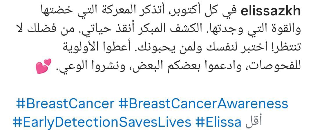 وقدمت إليسا لمتابعيها، نصيحة بالفحص المبكر، ونشر الوعي تجاه مرض السرطان، وسرعة الكشف عنه للتعامل معه والشفاء منه.