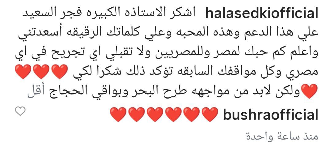 وكانت فجر السعيد كتبت: “من وجهة نظري هالة صدقي هي الصادقة في أي شيء تقوله ، وغيرها هو الكاذب والغير متربي للأسف، هالة صدقي تربية سيدة فاضلة ، والدتها رحمها الله التي كانت مربية أجيال أحسنت تربية أولادها، بالكويتي إمشي يا حرة وما عليچ مضرة".