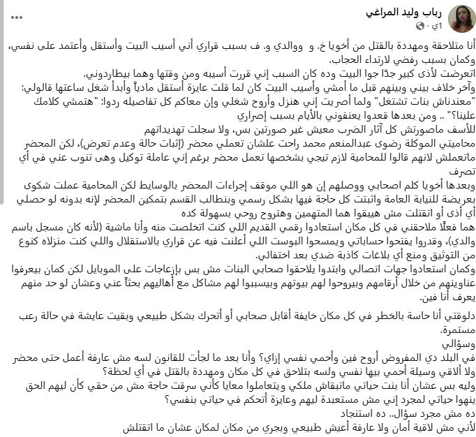 واختتمت رباب منشورها باستغاثة للجهات المعنية لحمايتها قائلة: “ده مش مجرد سؤال، ده استنجاد، لأني مش لاقيه أمان ، ولا عارفة أعيش طبيعي ، وبجري من مكان لمكان عشان ما اتقتـلش”.