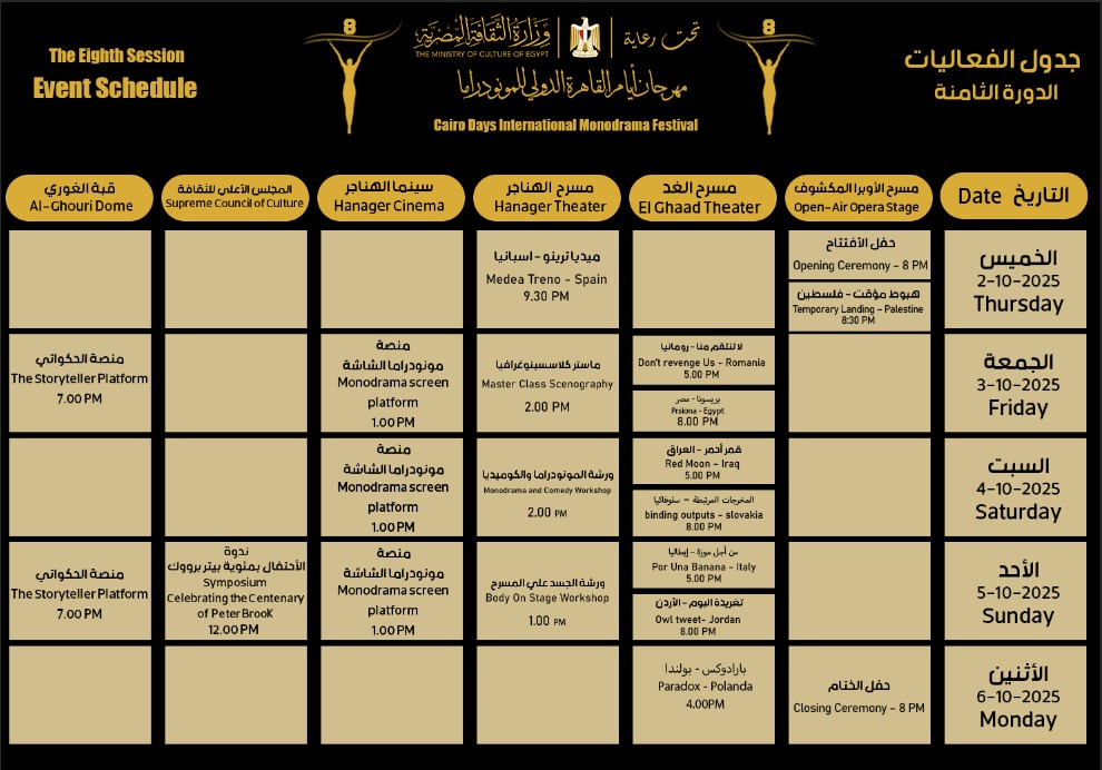 جدول فعاليات الدورة الثامنة لمهرجان أيام القاهرة الدولي للمونودراما