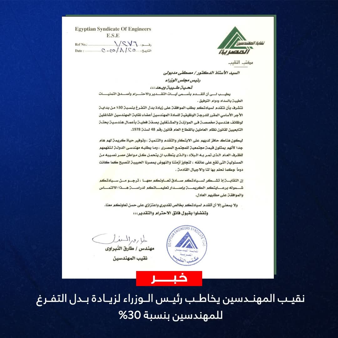 كشف مصدر مسؤول في تصريحات خاصة لموقع “الأيام المصرية” ، أن المهندس طارق النبراوي، نقيب المهندسين، تقدم بمذكرة رسمية إلى الدكتور مصطفى مدبولي، رئيس مجلس الوزراء، طالب فيها بالموافقة على زيادة بدل التفرغ للمهندسين بنسبة 30% من بداية الأجر الأساسي المقرر للدرجة الوظيفية.