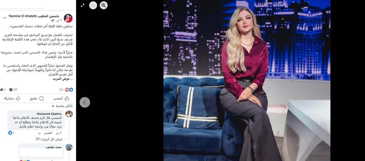 فاجأت الإعلامية ياسمين الخطيب، الجميع بإعلان انتهاء برنامجها "مساء الياسمين" الذي تقدمه على قناة الشمس.
