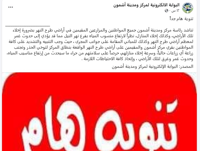 أصدرت رئاسة مركز ومدينة أشمون بمحافظة المنوفية بيانًا رسميًا طالبت فيه جميع المواطنين والمزارعين المقيمين على أراضي طرح النهر بسرعة إخلاء المنازل والمزارع، وذلك بعد ارتفاع منسوب المياه بفرع نهر النيل، مما يهدد بغمر مساحات واسعة من الأراضي والمباني الواقعة على جوانب المجرى.