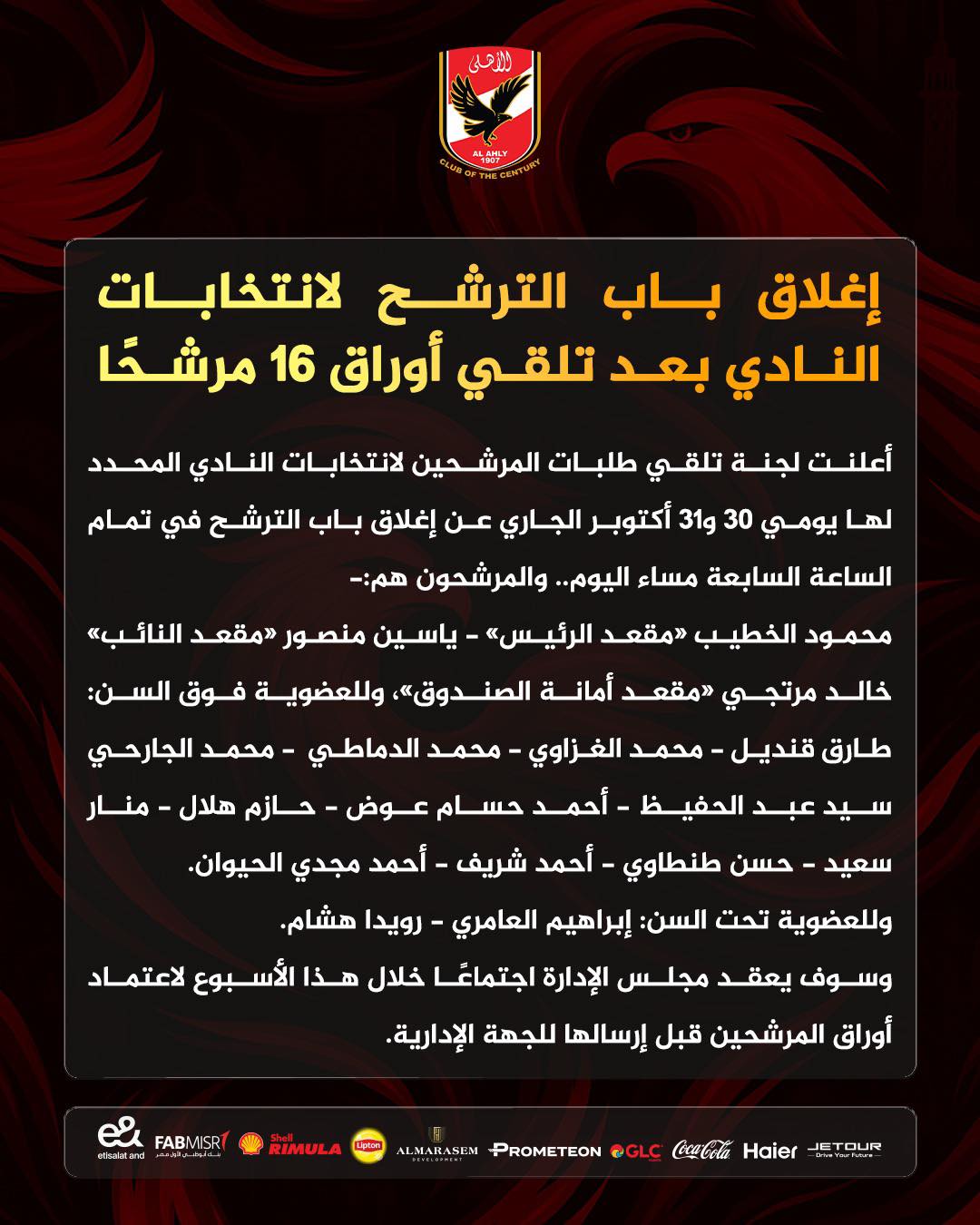 يحتفظ محمود الخطيب رئيس النادي الأهلي حاليًا، برئاسة القلعة الحمراء في الفترة من 2025-2029، وياسين منصور نائبا، والمهندس خالد مرتجي أمينا للصندوق بالإضافة إلى وإبراهيم العامري.. ورويدا هشام بالعضوية تحت السن، وذلك بالتزكية بعد عدم ترشح أحد للمنافسة على هذه المناصب، خلال الأيام السابقة، قبل غلق باب الترشح للانتخابات اليوم.