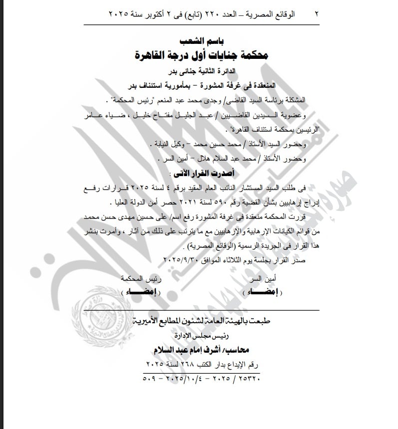 رفع اسم علي حسين مهدي من قوائم الإرهاب ،نشرت الجريدة الرسمية قرار المحكمة المنعقدة في غرفة المشورة، برفع إسم علي حسين مهدي حسن محمد من قوائم الكيانات الإرهابية والإرهابيين، وما يترتب على ذلك من آثار قانونية.