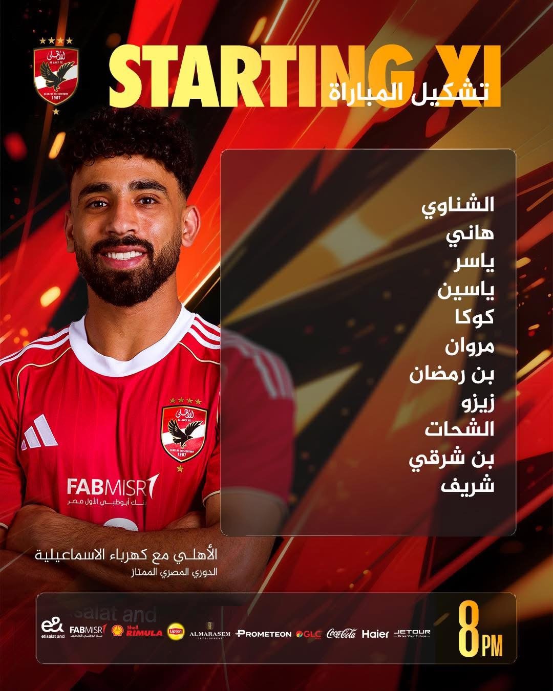 زيزو أساسيا، النحاس يعلن تشكيل الأهلي لمواجهة كهرباء الإسماعيلية بالدوري