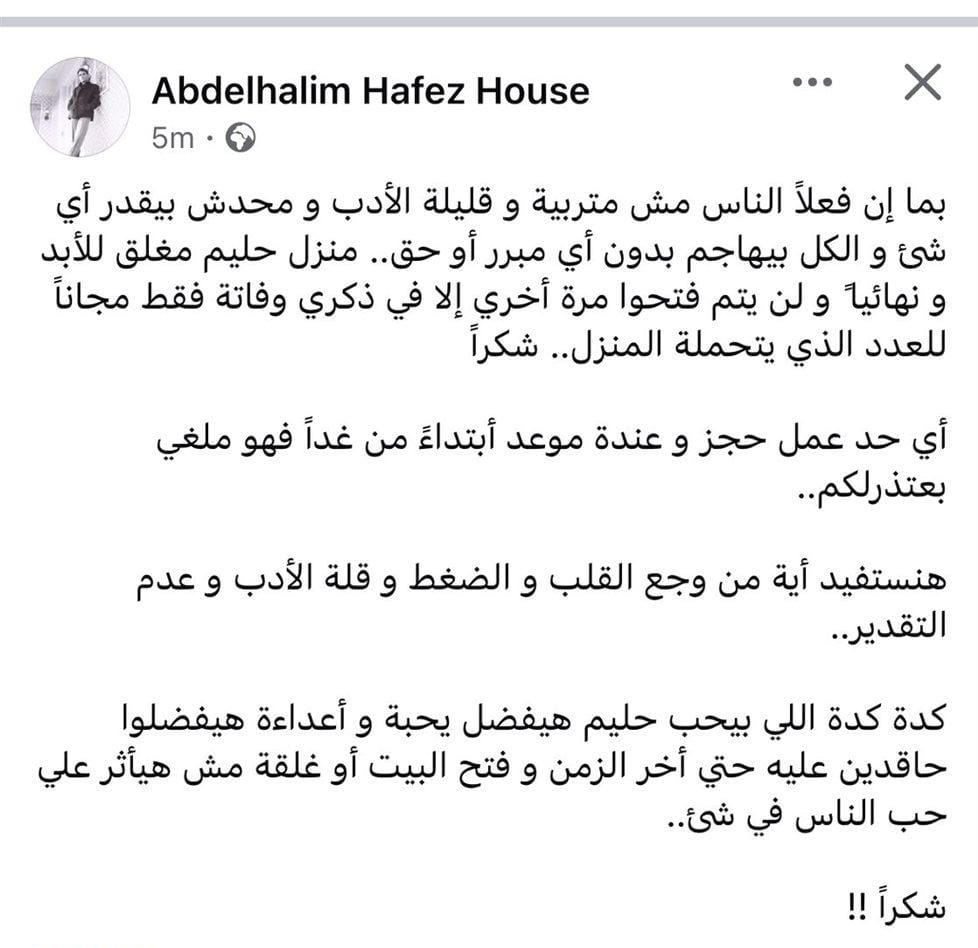 وجاء المنشور نصًا كالتالي،"بما إن فعلاً الناس مش متربية و قليلة الأدب و محدش بيقدر أي شئ والكل بيهاجم بدون أي مبرر أو حق.. منزل حليم مغلق للأبد ونهائياً ، ولن يتم فتحه مرة أخري، إلا في ذكري وفاته فقط مجاناً للعدد الذي يتحمله المنزل.. شكراً