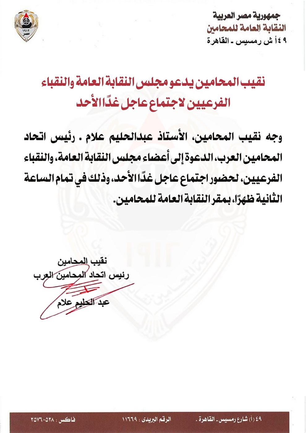 وجه نقيب المحامين، عبد الحليم علام، رئيس اتحاد المحامين العرب، الدعوة إلى أعضاء مجلس النقابة العامة، والنقباء الفرعيين، لحضور اجتماع عاجل غدًا الأحد، وذلك في تمام الساعة الثانية ظهرا، بمقر النقابة العامة للمحامين.