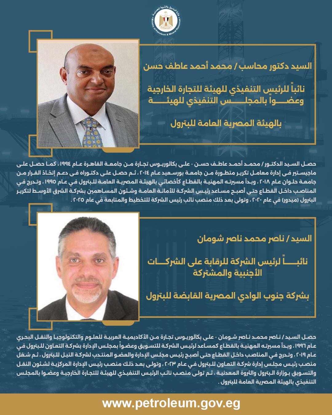 - الدكتور محاسب محمد أحمد عاطف، نائبًا للرئيس التنفيذي للهيئة المصرية العامة للبترول للتجارة الخارجية، وعضوًا بالمجلس التنفيذي للهيئة .
