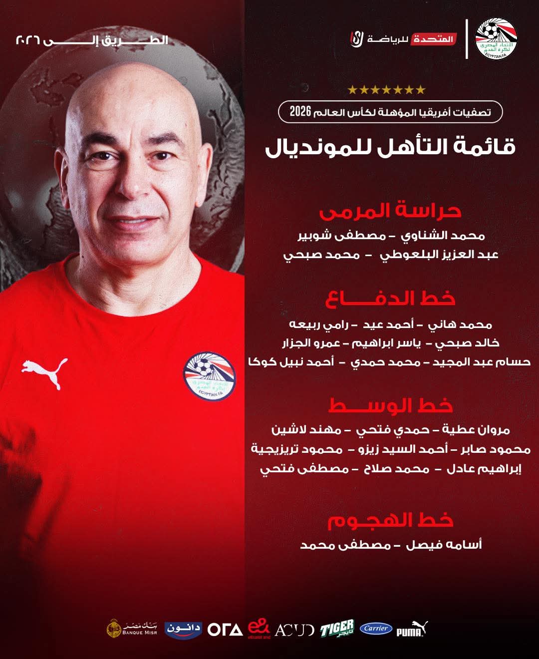 أعلن الجهاز الفني لمنتخب مصر الأول لكرة القدم بقيادة حسام حسن، قائمة اللاعبين المختارين لمعسكر شهر أكتوبر والذي ينطلق غدًا استعدادًا لمباراة جيبوتي المقرر لها 8 أكتوبر من الشهر الجاري بالمغرب، ثم مواجهة غينيا بيساو يوم 12 من نفس الشهر على أرضية ملعب استاد القاهرة الدولي ضمن مباريات الجولة التاسعة والعاشرة من التصفيات الأفريقية المؤهلة لنهائيات كأس العالم 2026