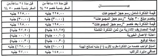 وأوضح جدول الهيئة كيفية حساب المبلغ المستحق رده عن تذكرة الدرجة الثالثة المكيفة المحجوزة على خط القاهرة/أسوان ضمن المجموعات في حالة العدول عن السفر، إذ تبلغ قيمة التذكرة 225 جنيهًا، ولمزيد من التفاصيل اطلع على الجدول التالي: