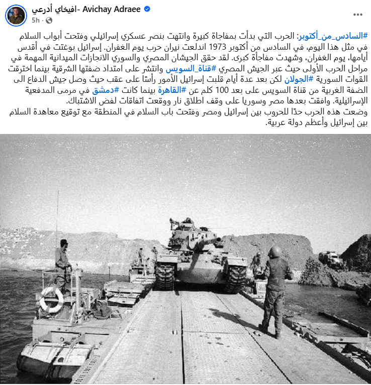 وتأتي كل هذه التضحية من قادة مصر وجيشها وشعبها، في الوقت الذي يزور فيه التاريخ وينسب النصر لإسرائيل المتحدث الرسمي باسم الاحتلال الإسرائيلي “أفيخاي أدرعي”، بأن نصر أكتوبر يُحسب لإسرائيل، إذ قام بكتابة منشور على صفحتها الرسمية على موقع التواصل الاجتماعي الفيسبوك، قال فيه أن "الحرب التي بدأت بمفاجأة كبيرة وانتهت بنصر عسكري إسرائيلي وفتحت أبواب السلام.