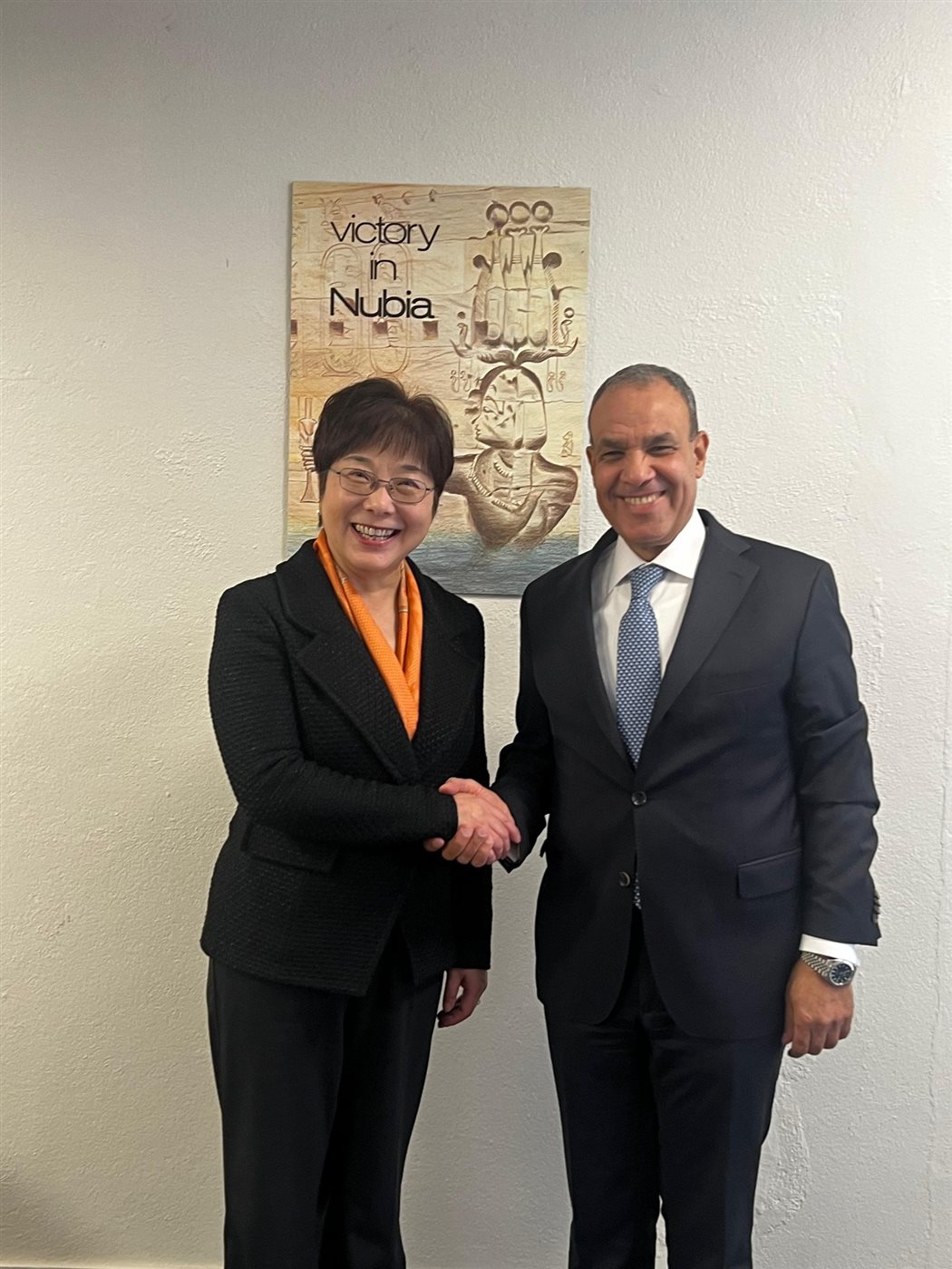 التقى الدكتور بدر عبد العاطي وزير الخارجية والهجرة وشئون المصريين بالخارج يوم الاثنين ٦ أكتوبر بالمندوبة الدائمة للصين لدى منظمة اليونسكو والرئيس الحالي لمجموعة الدول الآسيوية والمحيط الهادي، وذلك على هامش أعمال المجلس التنفيذي للمنظمة في باريس.
