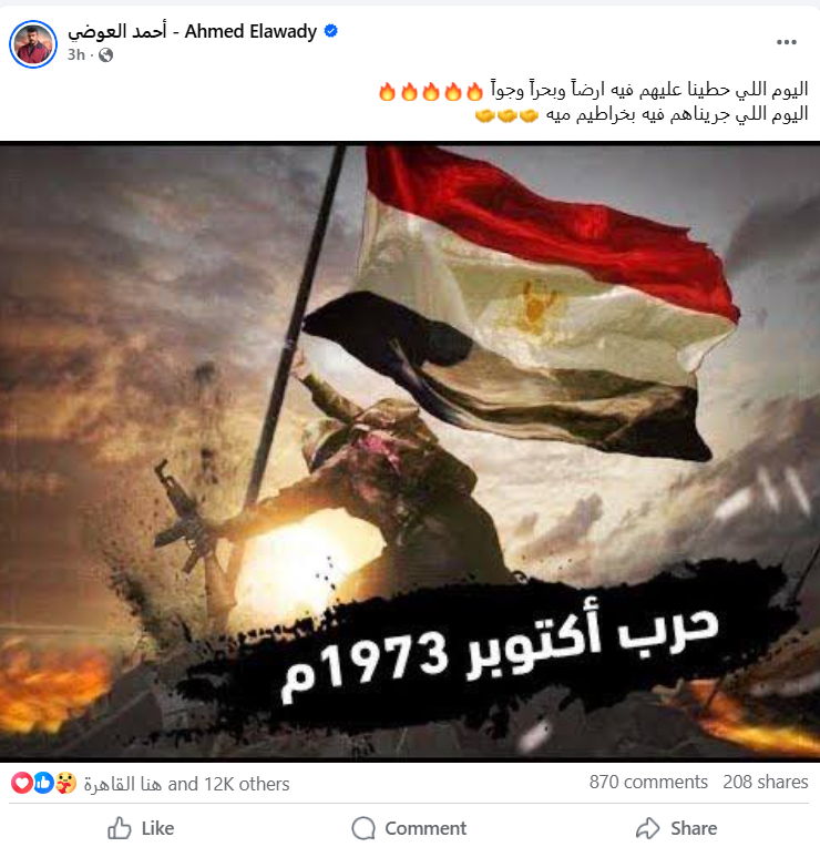 أحمد العوضي يحتفل بذكرى نصر أكتوبر: "حطينا عليهم أرض وبحر وجو"