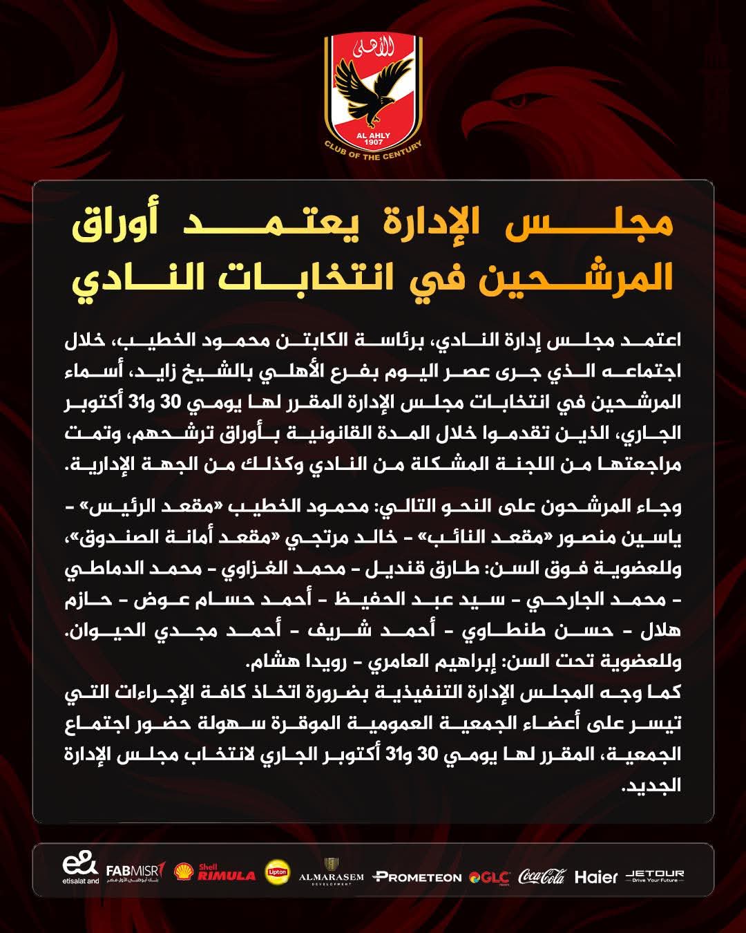 اعتمد مجلس إدارة النادي الأهلي، برئاسة محمود الخطيب، خلال اجتماعه الذي جرى عصر اليوم بفرع النادي بالشيخ زايد، أسماء المرشحين في انتخابات مجلس الإدارة المقرر لها يومي 30 و31 أكتوبر الجاري، الذين تقدموا خلال المدة القانونية بأوراق ترشحهم، وتمت مراجعتها من اللجنة المشكلة من النادي وكذلك من الجهة الإدارية.