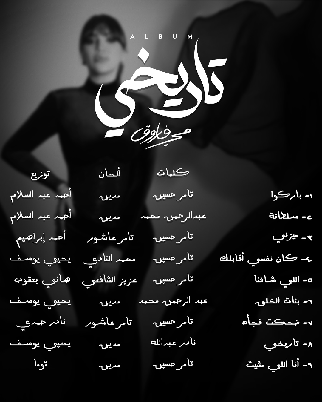 تطرح المطربة مي فاروق، آخر أغنيات أحدث ألبوم غنائي لها بعنوان تاريخي، اليوم الثلاثاء الموافق 7 أكتوبر، لتستكمل بها ألبومها المكون من 9 أغنيات.
