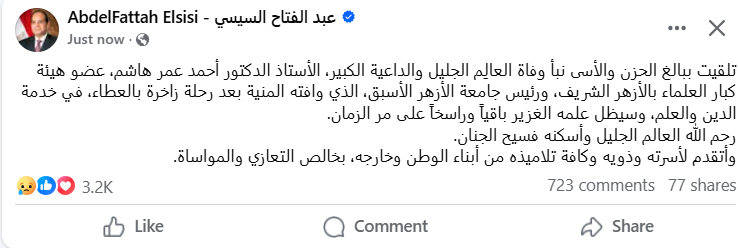 نعى الرئيس عبدالفتاح السيسي، رئيس الجمهورية ببالغ الحزن والأسى، العالِم الجليل والداعية الكبير الأستاذ الدكتور أحمد عمر هاشم عضو هيئة كبار العلماء بالأزهر الشريف، ورئيس جامعة الأزهر الأسبق، وذلك في منشور له على صفحته الرسمية على موقع التواصل الاجتماعي الفيسبوك، وجاء في المنشور: