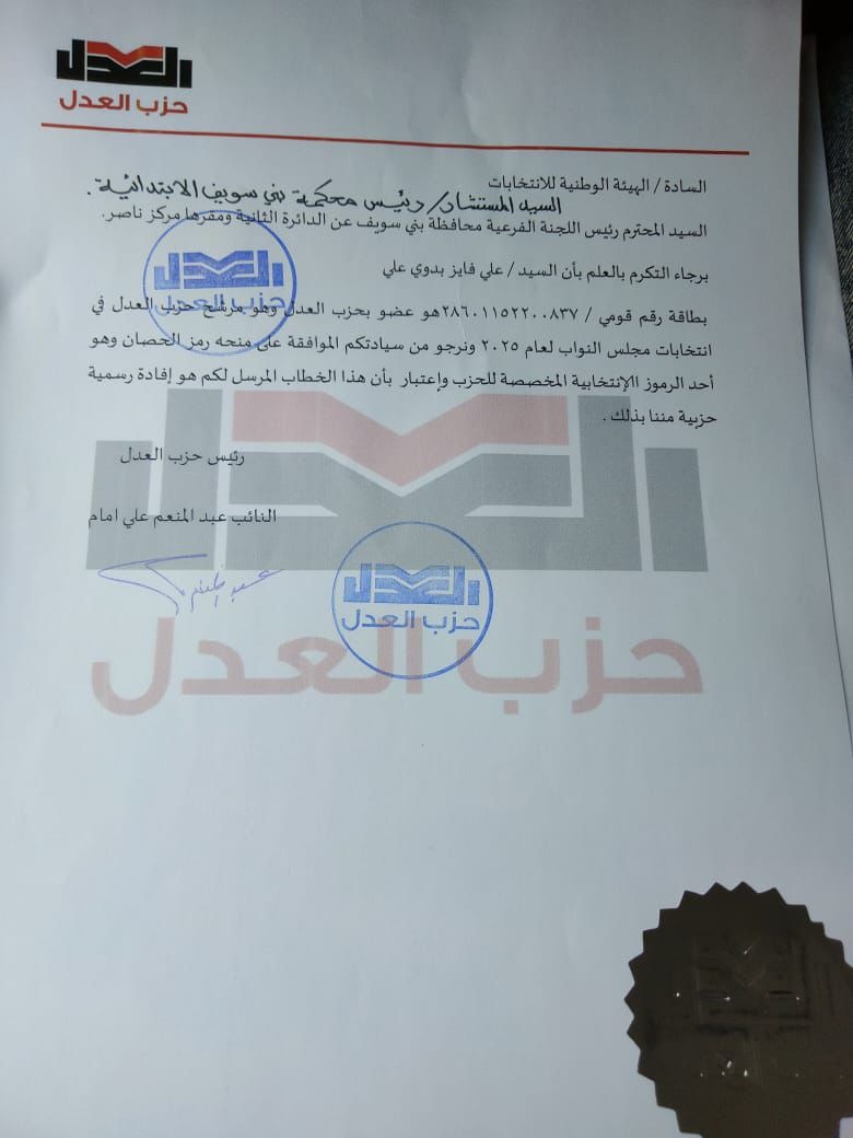 أعلن حزب العدل رسمياً عن دفعه بالمحامي علي فايز لخوض انتخابات مجلس النواب 2025، عن الدائرة الثانية ومقرها مركز ناصر بمحافظة بني سويف.