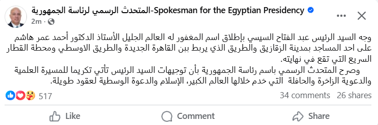 الرئيس السيسي يوجه بإطلاق اسم الدكتور أحمد عمر هاشم على مسجد وطريق ومحطة قطار