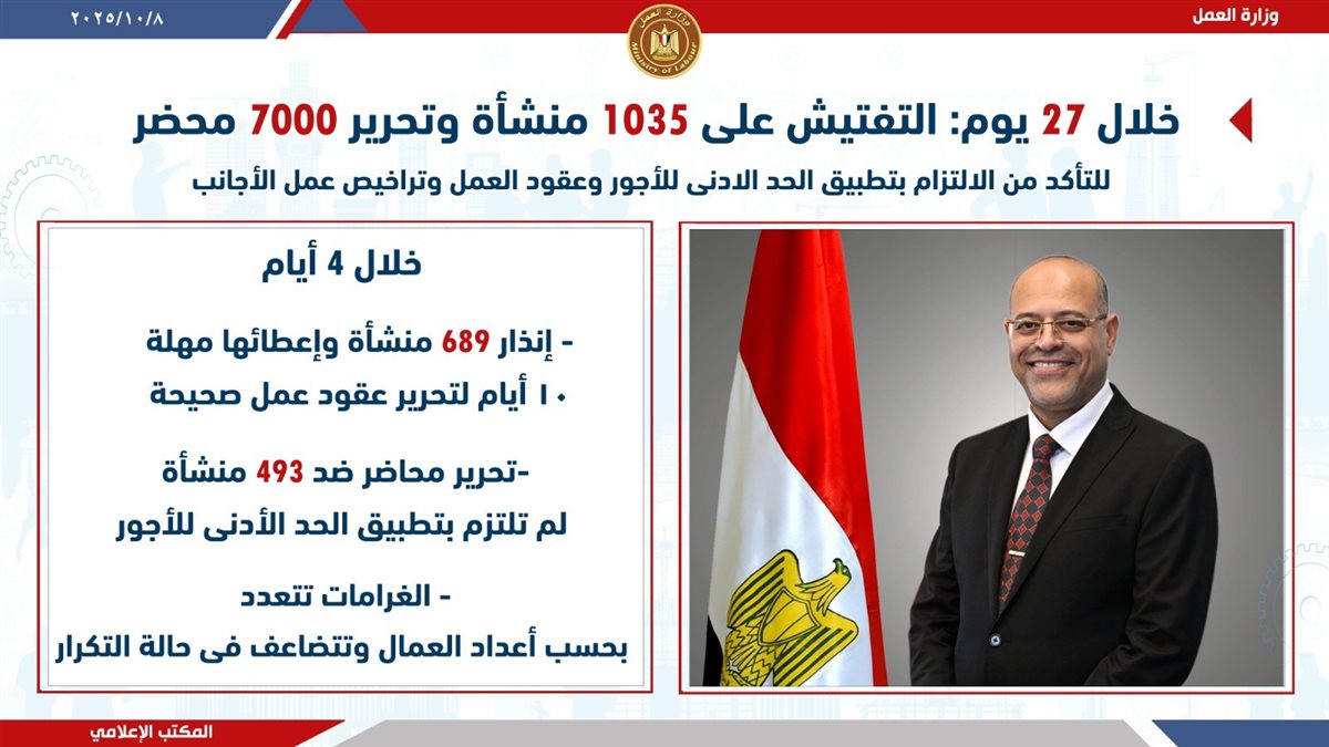 أعلن وزير العمل محمد جبران ، في تصريحات صحفية اليوم الأربعاء ،عن إستمرار الحملات التفتيشية المكثفة خلال الـ 27 يومًا الماضية على 1035 منشأة للتأكد من الالتزام بتراخيص عمل الاجانب، و تطبيق الحد الادنى للأجور، وعقود العمل طبقا لقانون العمل الجديد رقم 14 لسنة 2025 الذي بدأ تطبيقه منذ مطلع سبتمبر الماضي.