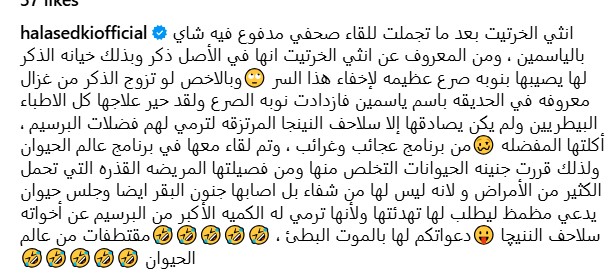 واختتمت: “ وتم لقاء معها في برنامج عالم الحيوان ولذلك قررت جنينة الحيوانات التخلص منها ومن فصيلتها المريضة القذرة التي تحمل الكثير من الأمراض و لأنه ليس لها من شفاء بل أصابها جنون البقر أيضا وجلس حيوان يدعى مظمظ ليطلب لها تهدئتها ولأنها ترمي له الكميه الأكبر من البرسيم عن أخواته سلاحف النينچا، دعواتكم لها بالموت البطئ مقتطفات من عالم الحيوان”.