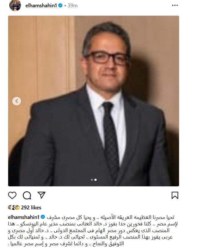 وكتبت : “تحيا مصرنا العظيمة العريقة الأصيلة .. و يحيا كل مصري مشرف لاسم مصر، كلنا فخورين جدا بفوز د. خالد العناني بمنصب مدير عام اليونسكو، هذا المنصب الذي يعكس دور مصر الهام في المجتمع الدولي”.