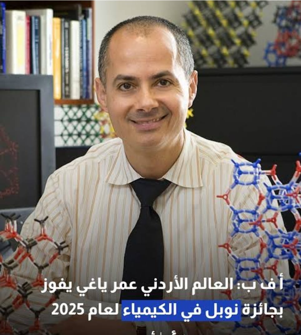 أعلنت الأكاديمية الملكية السويدية عن فوز الأردني من أصول فلسطينية، عمر م. ياغي (Omar M. Yaghi) من جامعة كاليفورنيا، بيركلي في الولايات المتحدة، بجائزة نوبل في الكيمياء لعام 2025، تقديرًا لإسهامه في تطوير الأطر الفلزية العضوية (Metal-Organic Frameworks)، وهي مواد مبتكرة أحدثت ثورة في مجال الكيمياء.