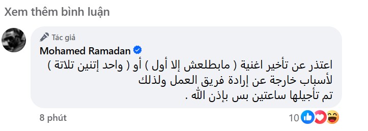 وقرر محمد رمضان، أن يؤجل طرح أغنيته لمدة ساعتين فقط، وكتب نصًا: اعتذر عن تأخير أغنية ( مابطلعش إلا أول ) أو ( واحد إتنين تلاتة ) لأسباب خارجة عن إرادة فريق العمل ولذلك، تم تأجيلها ساعتين بس بإذن الله".