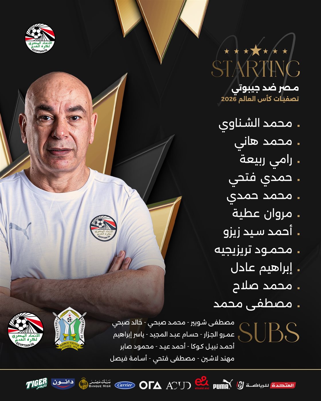 أعلن حسام حسن المدير الفني لمنتخب مصر الأول لكرة القدم، تشكيل المنتخب في مواجهة جيبوتي، المقرر إقامتها في تمام الساعة السابعة مساء اليوم الأربعاء بتوقيت القاهرة، وذلك ضمن مواجهات الجولة التاسعة من التصفيات الأفريقية المؤهلة لنهائيات كأس العالم 2026.