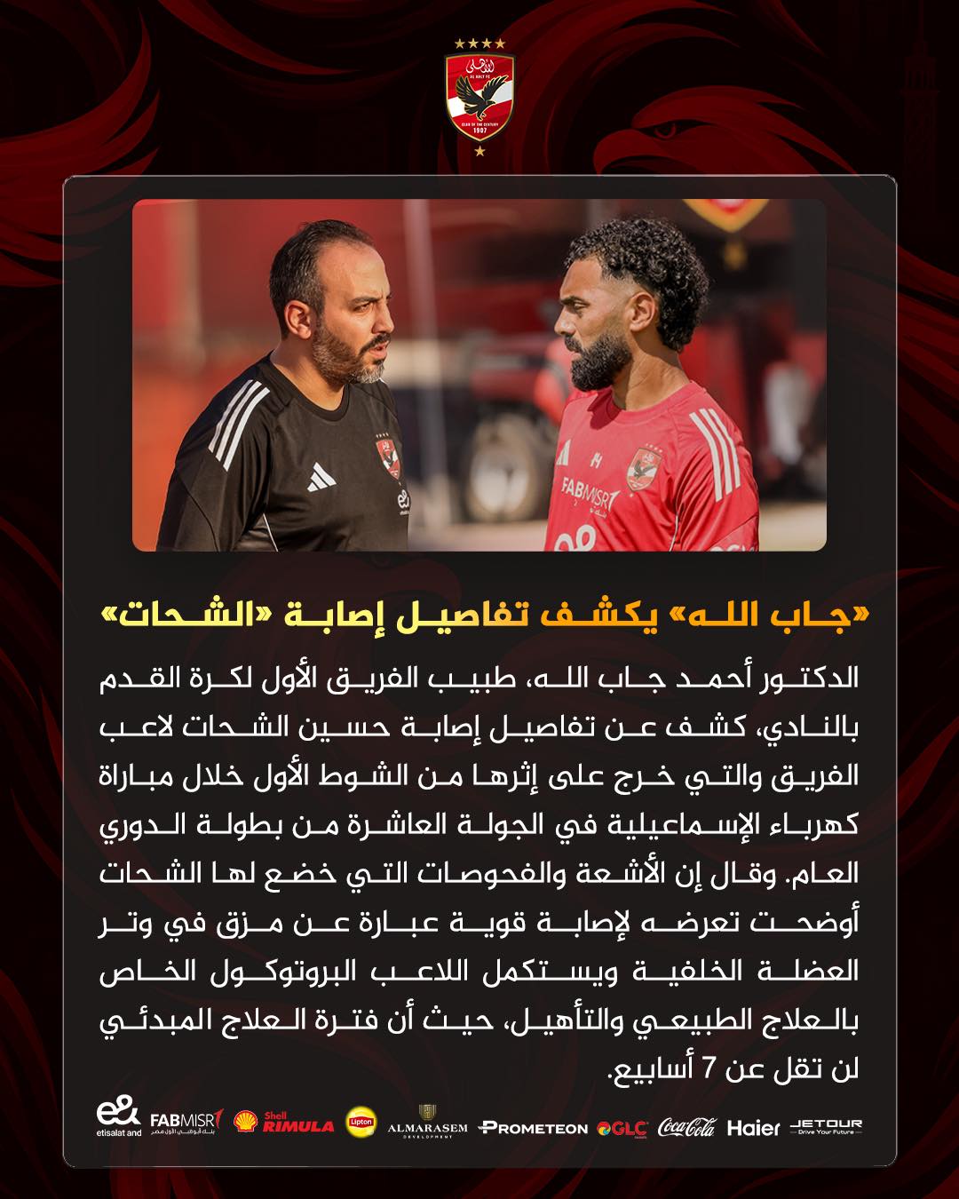 وأحمد جاب الله طبي الفريق، إن الأشعة والفحوصات التي خضع لها الشحات أوضحت تعرضه لإصابة قوية عبارة عن مزق في وتر العضلة الخلفية ويستكمل اللاعب البروتوكول الخاص بالعلاج الطبيعي والتأهيل، حيث أن فترة العلاج المبدئي لن تقل عن 7 أسابيع.