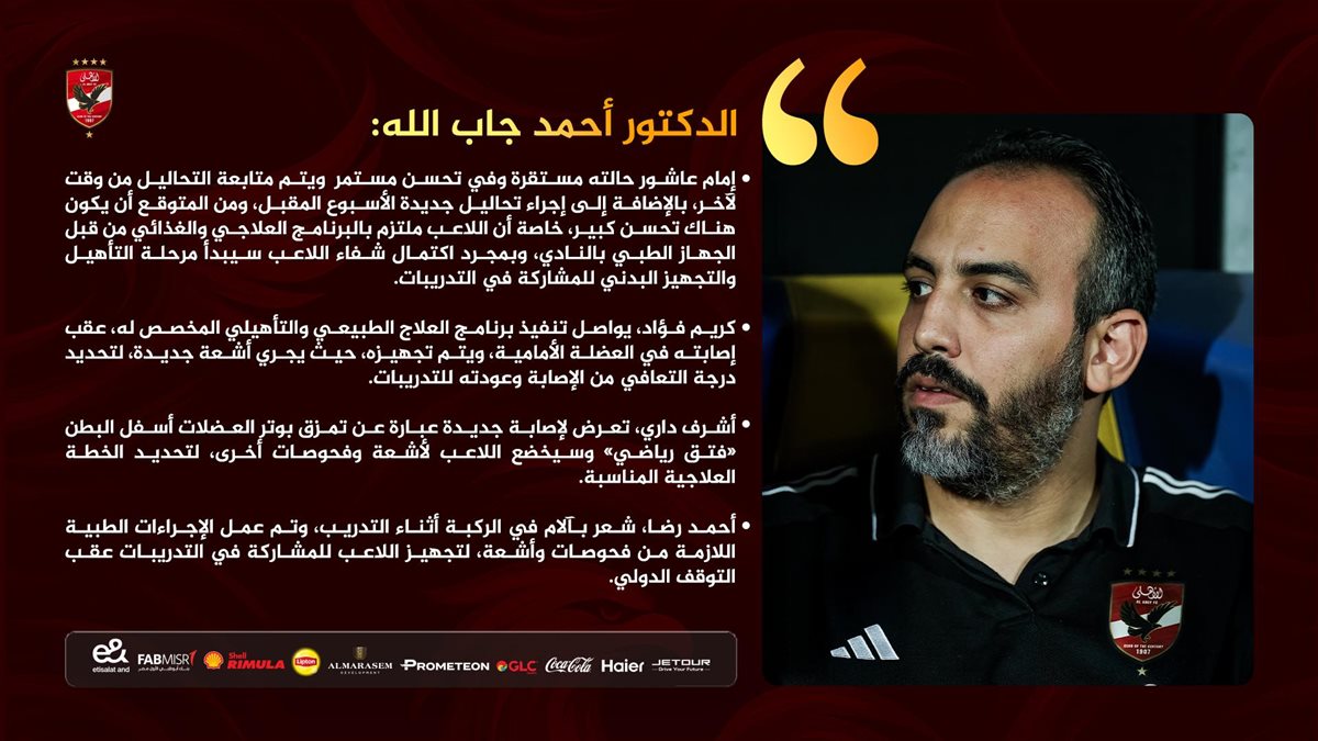 كشف الدكتور أحمد جاب الله، طبيب الفريق الأول لكرة القدم بالنادي الأهلي، عن تفاصيل إصابة رباعي الفريق إمام عاشور وكريم فؤاد وأشرف داري وأحمد رضا.