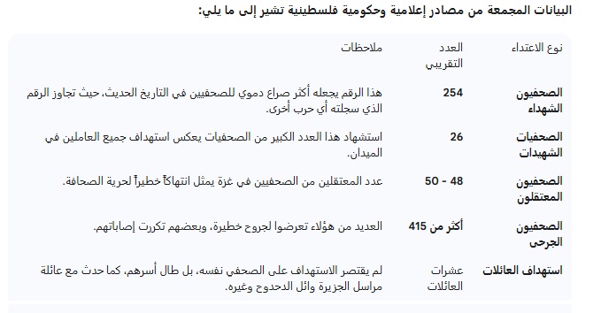 الصحفيون الشهداء: 254 هذا الرقم يجعله أكثر صراع دموي للصحفيين في التاريخ الحديث، حيث تجاوز الرقم الذي سجلته أي حرب أخرى.