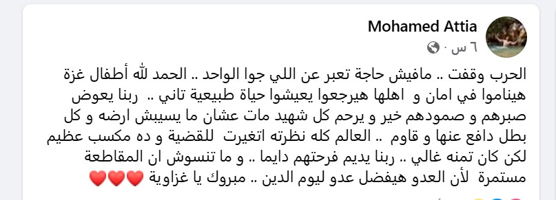 وكتب : الحرب وقفت، ما فيش حاجة تعبر عن اللي جوا الواحد، الحمد لله أطفال غزة هيناموا في أمان، وأهلها هيرجعوا يعيشوا حياة طبيعية تاني".