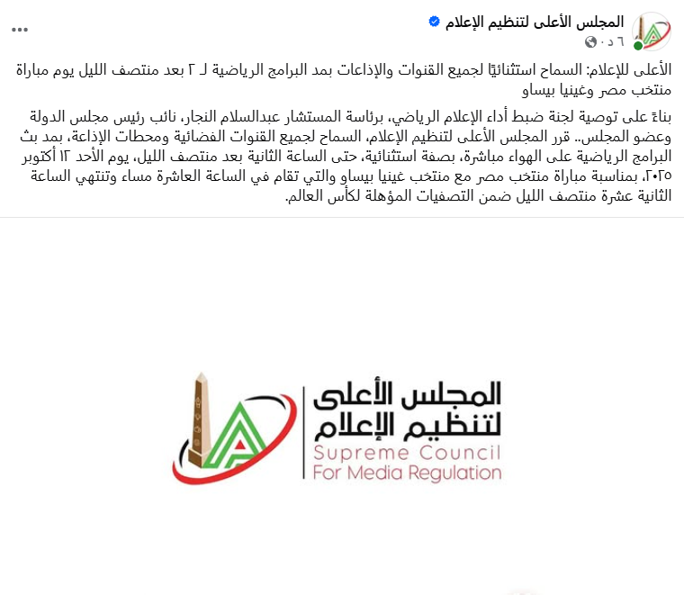وقرر المجلس الأعلى لتنظيم الإعلام، السماح لجميع القنوات الفضائية ومحطات الإذاعة، بمد بث البرامج الرياضية على الهواء مباشرة، بصفة استثنائية، حتى الساعة الثانية بعد منتصف الليل، يوم الأحد ١٢ أكتوبر ٢٠٢٥، بمناسبة مباراة منتخب مصر مع منتخب غينيا بيساو والتي تقام في الساعة العاشرة مساء وتنتهي الساعة الثانية عشرة منتصف الليل ضمن التصفيات المؤهلة لكأس العالم 2026.
