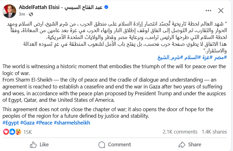 وكتب في منشور خاص عبر صفحته على موقع التواصل الاجتماعي الفيسبوك: إن العالم شهد لحظة تاريخية تُجسّد انتصار إرادة السلام على منطق الحرب، من شرم الشيخ، أرض السلام ومهد الحوار والتقارب، تم التوصل إلى اتفاق لوقف إطلاق النار وإنهاء الحرب في غزة بعد عامين من المعاناة، وفقاً لخطة السلام التي طرحها الرئيس ترامب، وبرعاية مصر وقطر والولايات المتحدة الأمريكية.