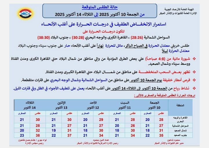 كشفت الهيئة العامة للأرصاد الجوية، عن حالة الطقس المتوقعة، اليوم الجمعة الموافق 10 من أكتوبر 2025، في جميع أنحاء الجمهورية، إذ يسود حالة من الاستقرار في حالة الجو، أي يشهد اليوم طقسًا خريفيًا معتدل الحرارة في الصباح الباكر، مائل للحرارة نهارًا على أغلب الأنحاء، حار على جنوب سيناء وجنوب البلاد، معتدل الحرارة ليلاً.