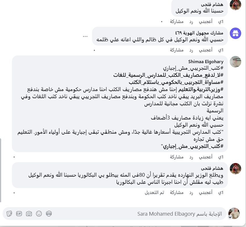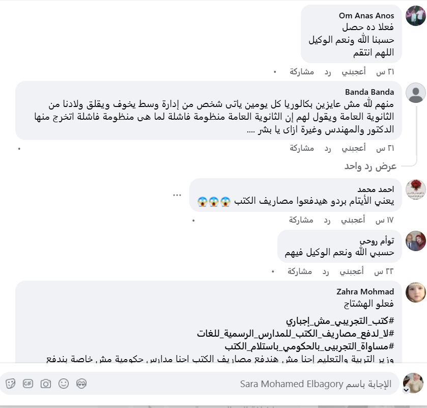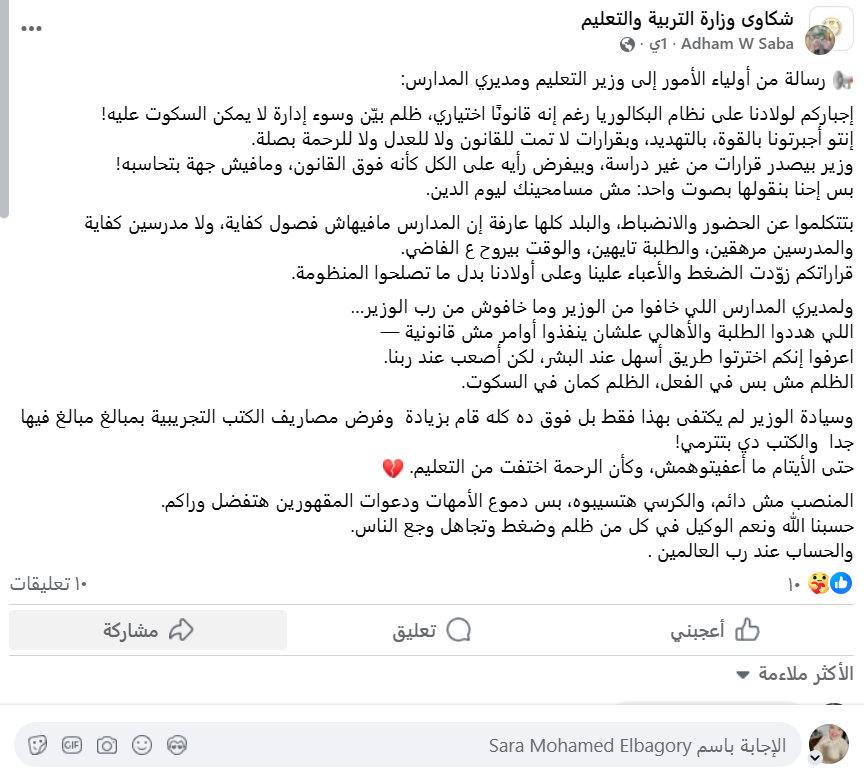 واستكمل أولياء الأمور استغاثتهم من إلزام الطلاب بالحضور رغم عدم وجود فصول ومدرسين كافيين: "بتتكلموا عن الحضور والانضباط، والبلد كلها عارفة إن المدارس مافيهاش فصول كفاية، ولا مدرسين كفاية والمدرسين مرهقين، والطلبة تايهين، والوقت بيروح ع الفاضي، قراراتكم زوّدت الضغط والأعباء علينا وعلى أولادنا بدل ما تصلحوا المنظومة".